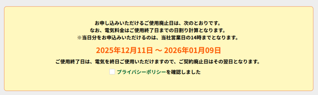 申込時には、電気の使用停止または開始を希望する日付の指定が必要です。