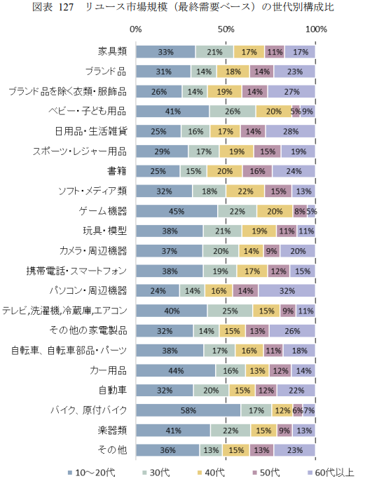 環境省が発表した「令和6年度リユース市場規模調査報告書」によると、楽器のリユース市場は全体(3兆5,000億円)の5番目の規模(1,011億円)であり、中でも10〜20代の需要が全体の41%と高い傾向にあります。