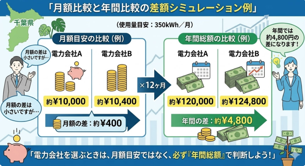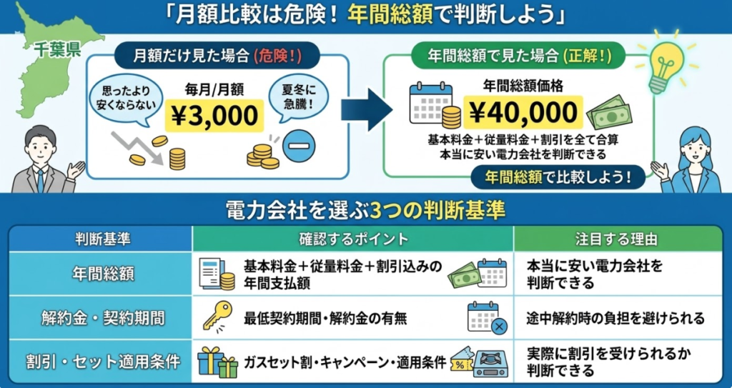 千葉県で電力会社を選ぶときは、月額ではなく年間総額を基準に比較することが重要です。