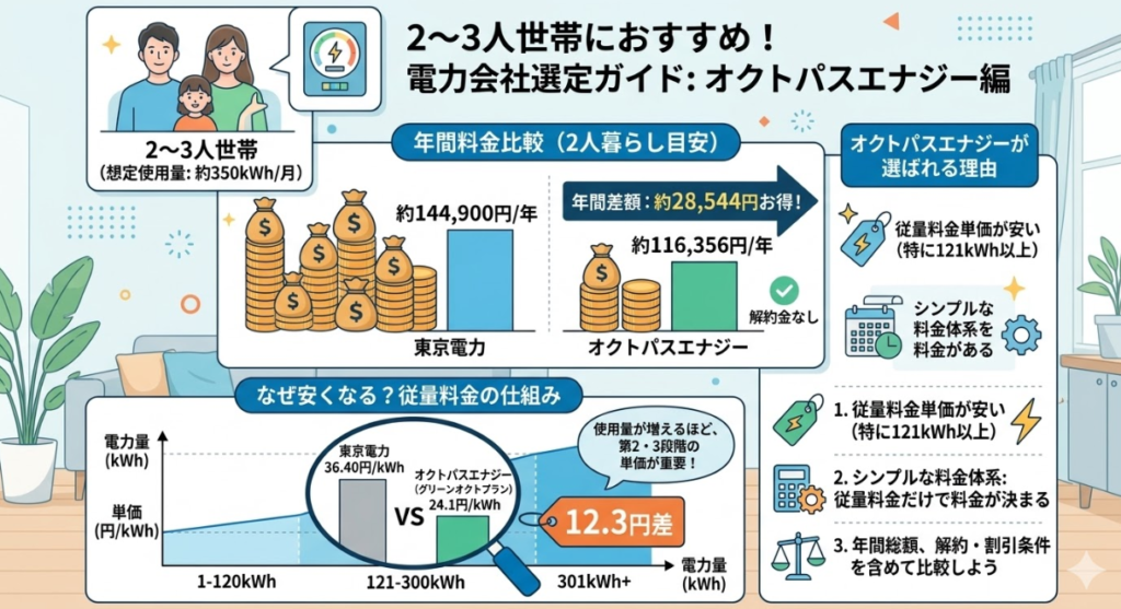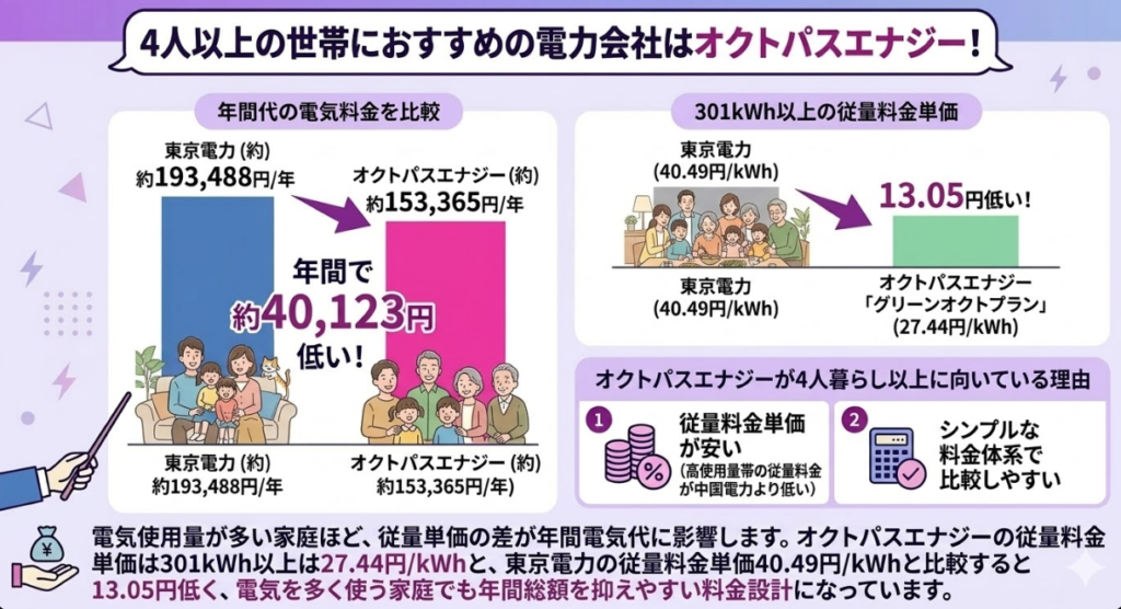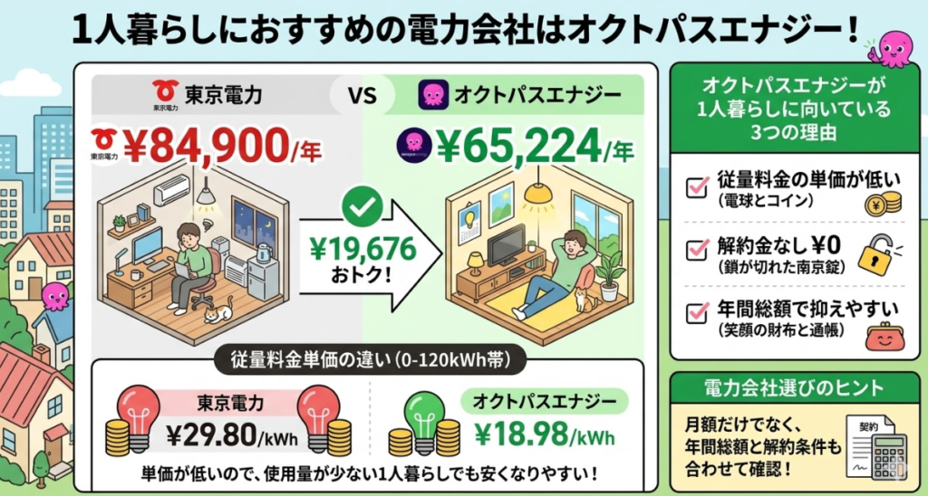 東京電力とオクトパスエナジーを比較すると、1人暮らしでは約19,676円、2〜3人世帯では約28,544円、4人以上世帯では約40,123円の差があります。