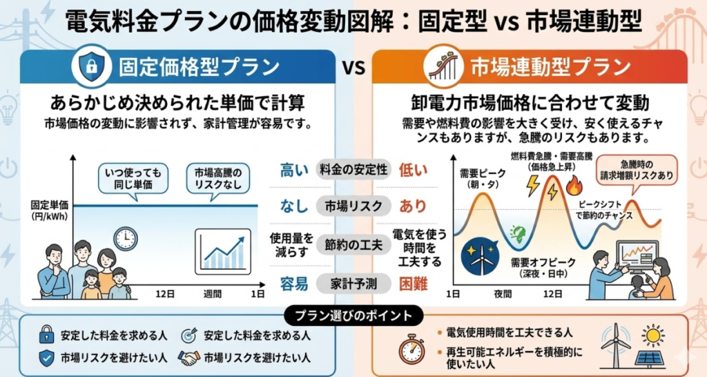 ただし、市場価格の影響を受けるプランの場合、電力市場が高い時期は単価が上がる可能性もあるため、固定単価型よりも変動幅が出る点は理解が必要です。