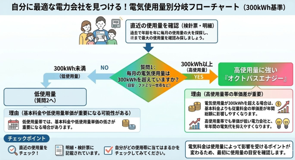 | 年間総額が安い | オクトパスエナジー | 毎月の電気使用量が多い人 電気代をとにかく下げたい人 月額より年額で比較したい人 |