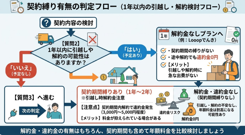 | 解約金や契約期間の縛りがない | Looopでんき | 引っ越しや乗り換え予定がある人 転勤の可能性がある人 短期間だけ使う可能性がある人 |