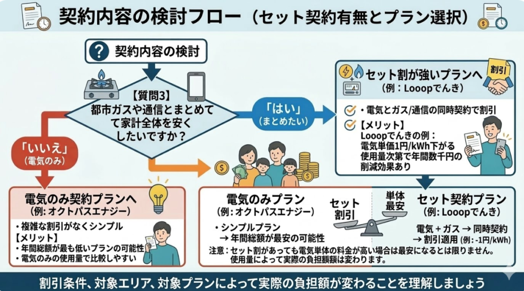 「年間総額」「契約条件」「割引条件」を基準に比較すると、自分の家庭に合った電力会社を判断しやすくなります。