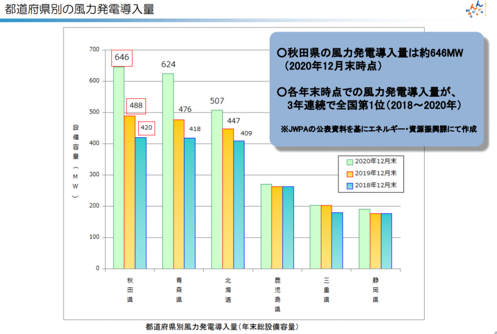 秋田県の風力発電の割合は高く、2018〜2020年の間の導入量は3年連読全国第1位の実績です。