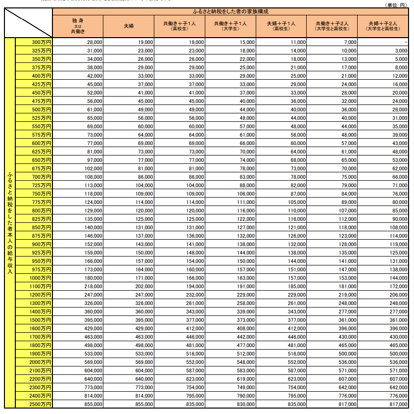 以下は、ふるさと納税をした本人の給与収入とその家族構成のパターン別のふるさと納税額の目安です。