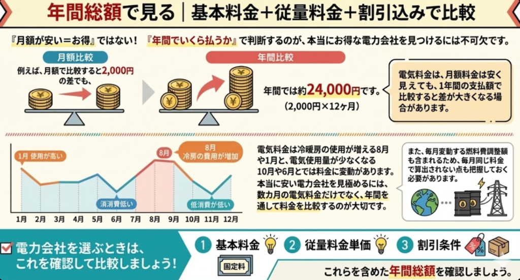 また、選ぶ会社によって料金体系・燃料費調整額・解約手数料・支払い方法などが異なり、条件次第では電気代の節約にならない場合もあります。