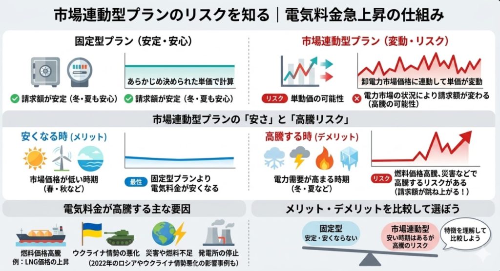 新電力は燃料費調整額や電源調達コストの設定方法が異なるため、市場価格が高騰すると従来の大手電力会社より割高になる場合があります。