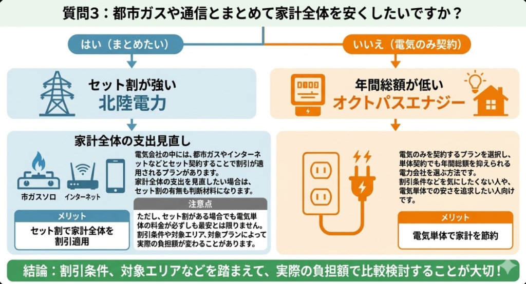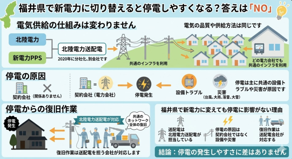 送電や配電のインフラは北陸電力が一元的に管理しているため、電力の安定性や品質は変わらず、違いが出るのは料金プランや契約条件のみです。