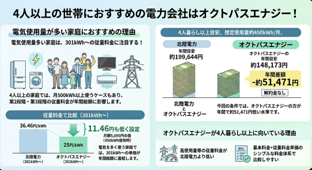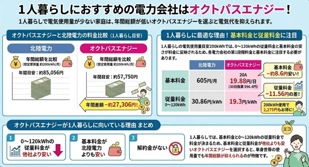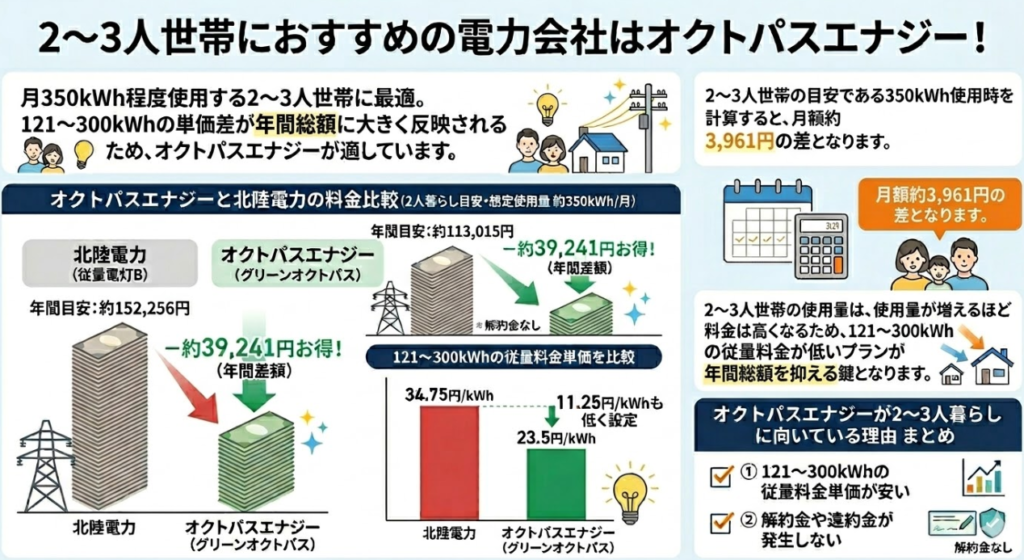福井県内で利用できる新電力の中でも、オクトパスエナジーは料金の安さが目立ち、単身から二人暮らし・三人以上の家庭まで北陸電力より安いシミュレーション結果が出ています。