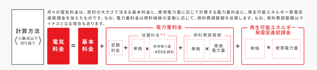 | 従量料金単価 | 0〜120kWhまで29.80円 121〜300kWhまで36.40円 301kWh〜40.49円 |