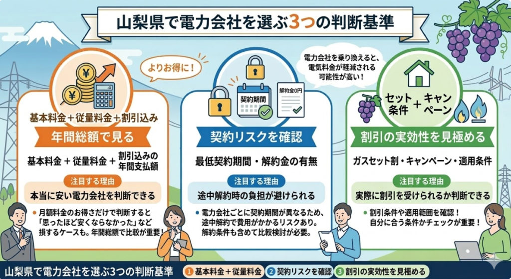 山梨県で電力会社を選ぶときは、「年間総額の安さ」「解約金や契約期間の縛りがない」「セット割やキャーンペーンの有無」の3つを基準に比較することが重要です。