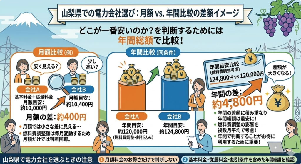 山梨県で電力会社を選ぶときは、月額ではなく年間総額を基準に比較することが重要です。