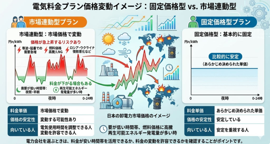 例えば、市場連動型プランでは電力市場価格の影響を受けるため、電力需要が高まる時期は料金が上がる場合もあります。