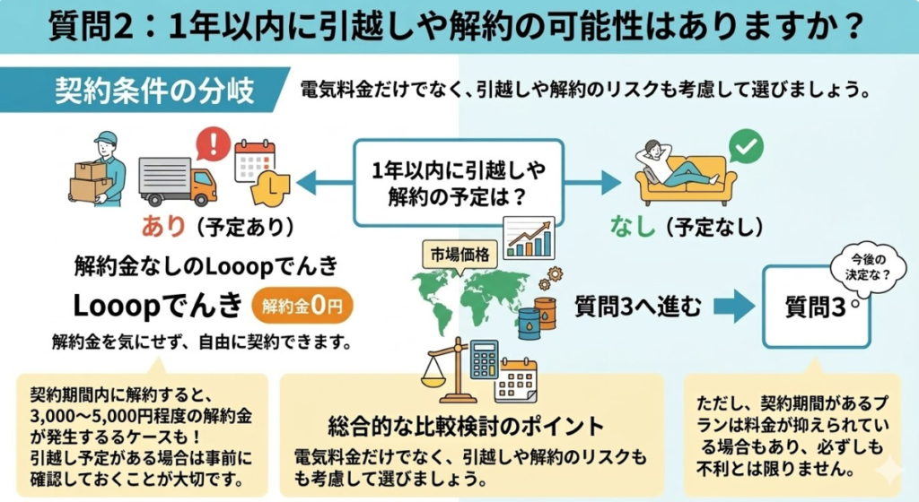 | 解約金や契約期間の縛りがない | Looopでんき | 引っ越しや乗り換え予定がある人 転勤の可能性がある人 短期間だけ使う可能性がある人 |