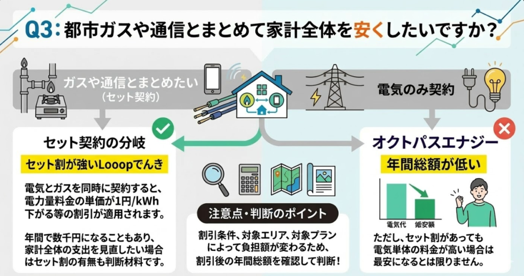 | セット割や還元がある | Looopでんき | ガスもまとめたい人 電気とガスを同じ会社で管理したい人 条件が合えば還元を受けたい人 |