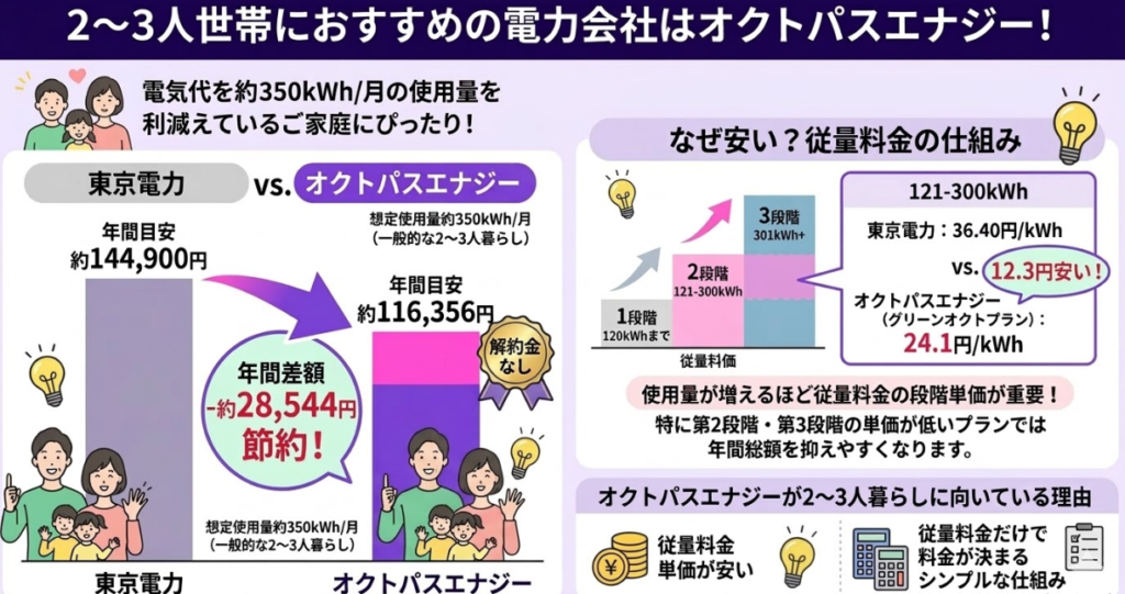 東京電力とオクトパスエナジーを比較すると、1人暮らしでは約19,676円、2〜3人世帯では約28,544円、4人以上世帯では約40,123円の電気料金を減額できる可能性があります。