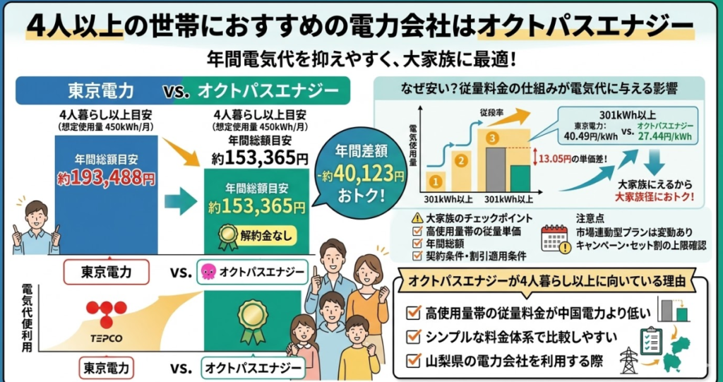 例えば、山梨県でおすすめの電力会社オクトパスエナジーと東京電力を比較すると1人暮らしから4人以上世帯まで年間15,000〜40,000円以上減額できる試算結果も出ています。