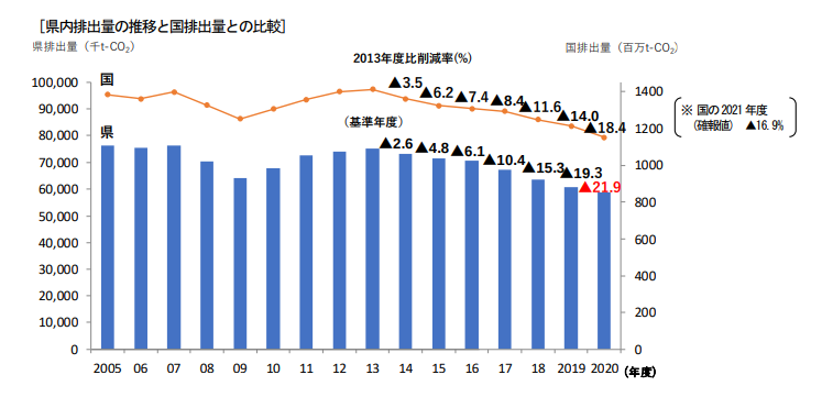 2020年度の温室効果ガス排出量を5,875万トンとし、2013年度比で排出量を21.9%削減二成功しています。