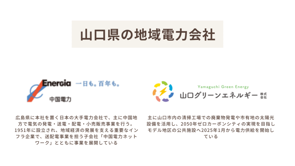 山口県の地域を代表する電力会社には、中国エリアの大手電力会社である「中国電力」や、地域密着型の新電力「山口グリーンエネルギー」が挙げられます。