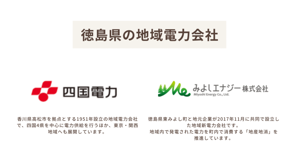 徳島県の地域を代表する電力会社には、四国エリアの大手電力会社である「四国電力」や、地域密着型の新電力「みよしエナジー」が挙げられます。