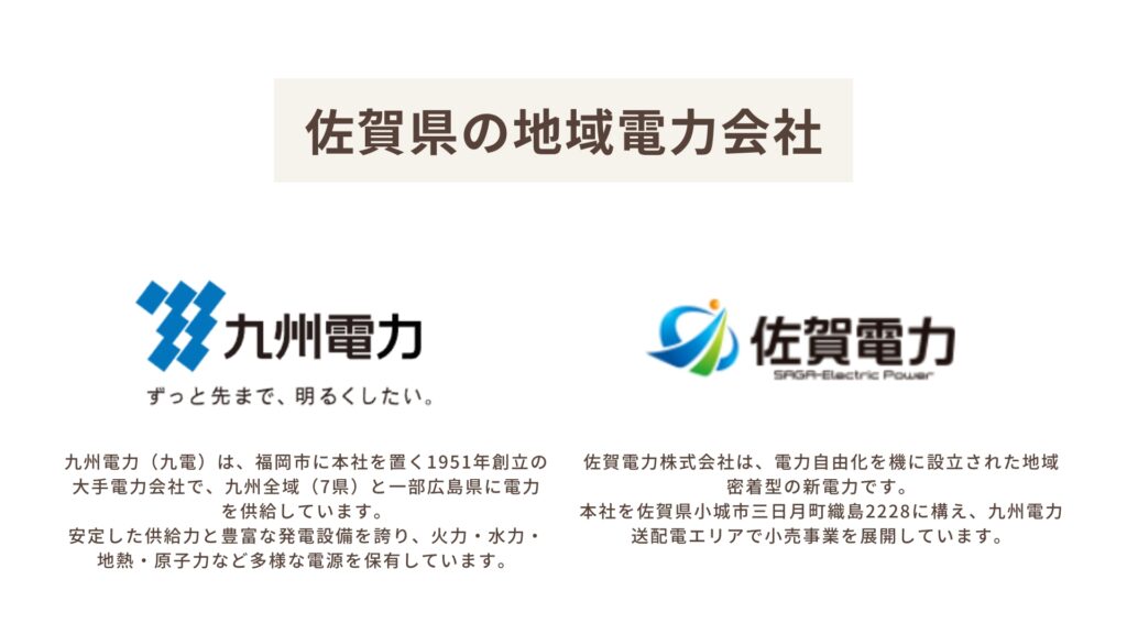 佐賀県の地域を代表する電力会社には、九州エリアの大手電力会社である「九州電力」や、地域密着型の新電力「佐賀電力」が挙げられます。
