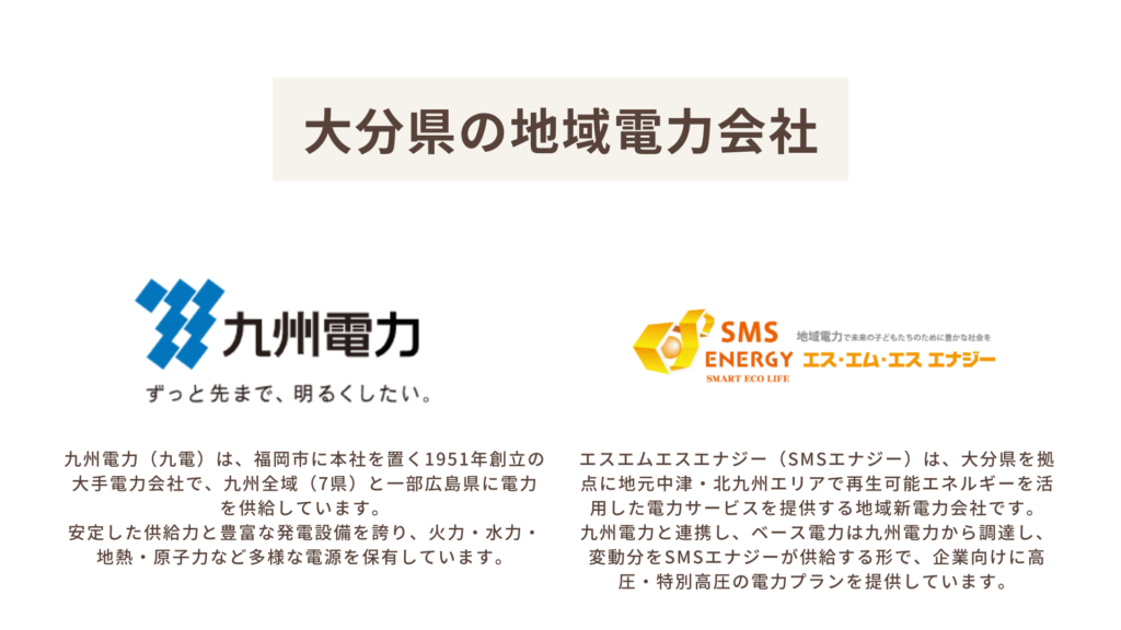 大分県の地域を代表する電力会社には、九州エリアの大手電力会社である「九州電力」や、地域密着型の新電力「エスエムエスエナジー(SMSエナジー)」が挙げられます。