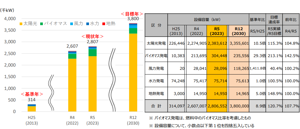 再生可能エネルギーの導入状況については、2030年度までに約3,800kWを目標としており、2023年度時点で2,807kWが導入されています。