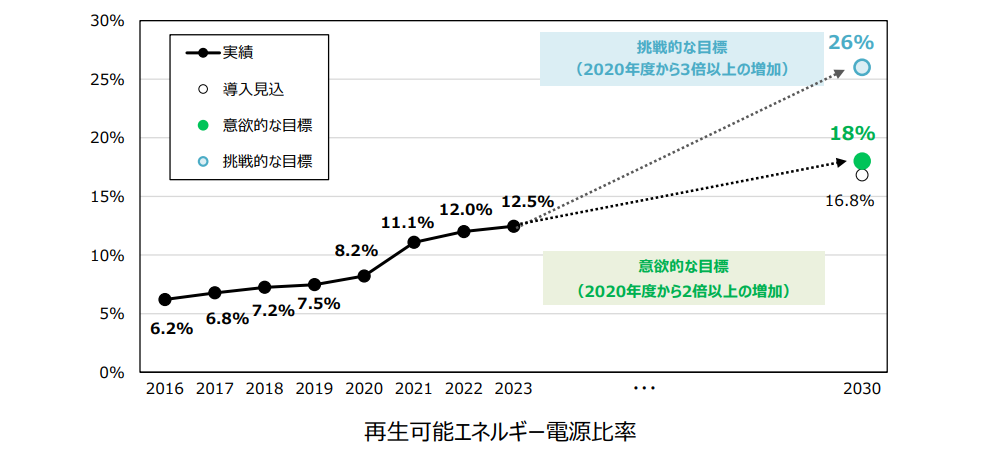 2030年度までに再生可能エネルギー電源比率を2020年度比で2倍の18%、さらに挑戦的な目標として3倍の26%を目指しています。
