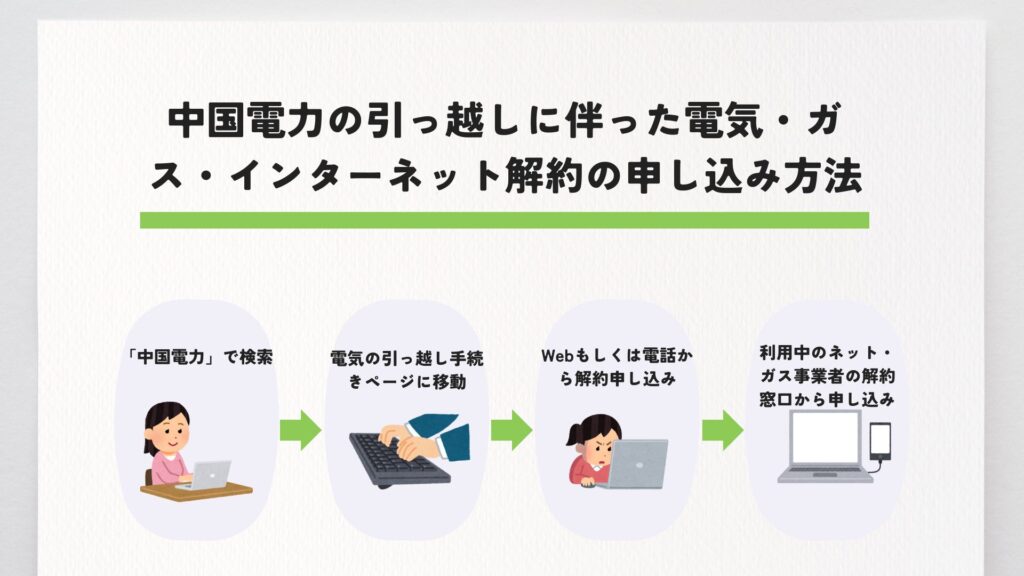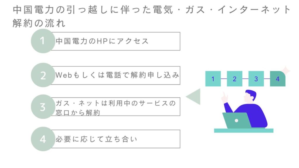 中国電力の引っ越しに伴った電気・ガス・インターネット解約の流れは以下の通りです。