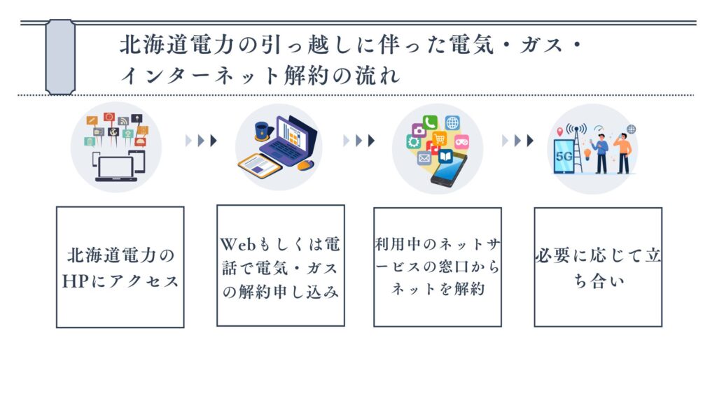 北海道電力の引っ越しに伴った電気・ガス・インターネット解約の流れは以下の通りです。