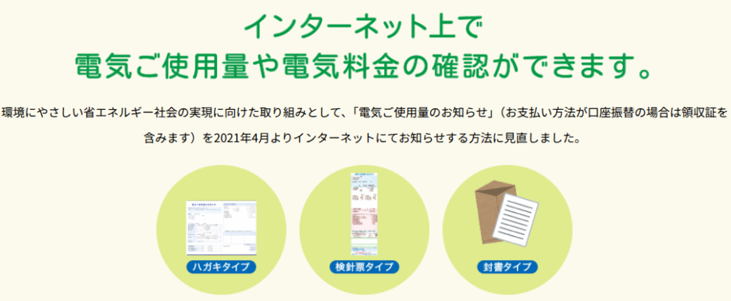 電力会社から送付される「電気ご使用量のお知らせ(検針票)」や請求書、もしくは各電力会社マイページ等から確認できます。