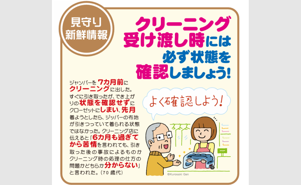 独立行政法人国民生活センターでは、クリーニング店のトラブルは時間がたつと原因の特定が難しくなることから、受け取る際にすぐに衣類の状態や処理方法店舗側と確認するように注意喚起されています。