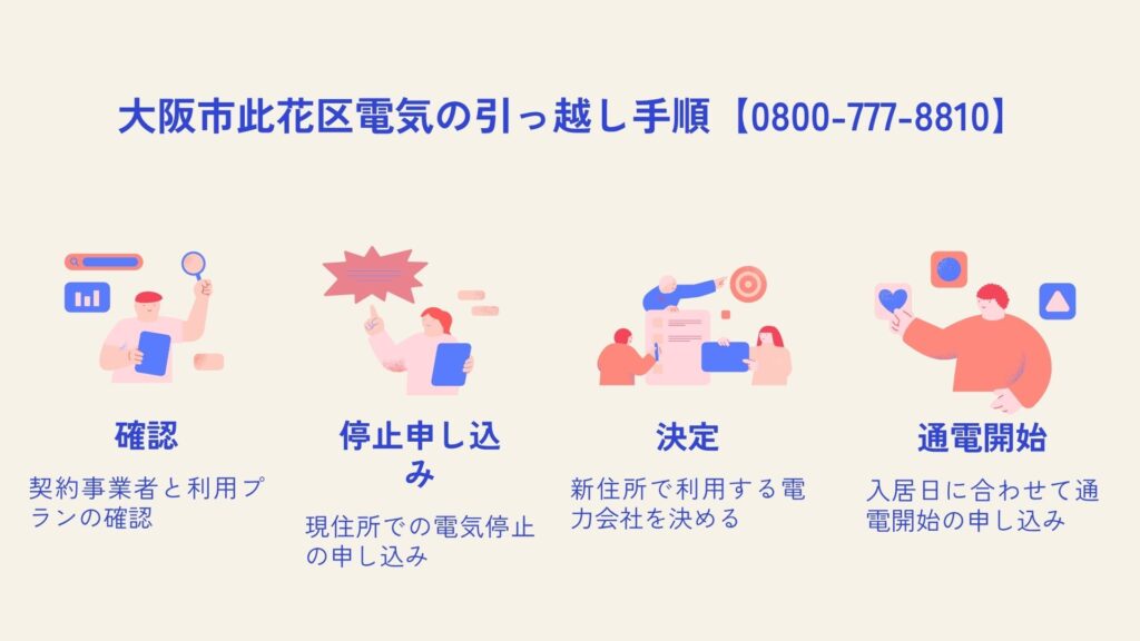以下では、利用数の多い関西電力を例に電気の引っ越し手続きの手順を解説します。