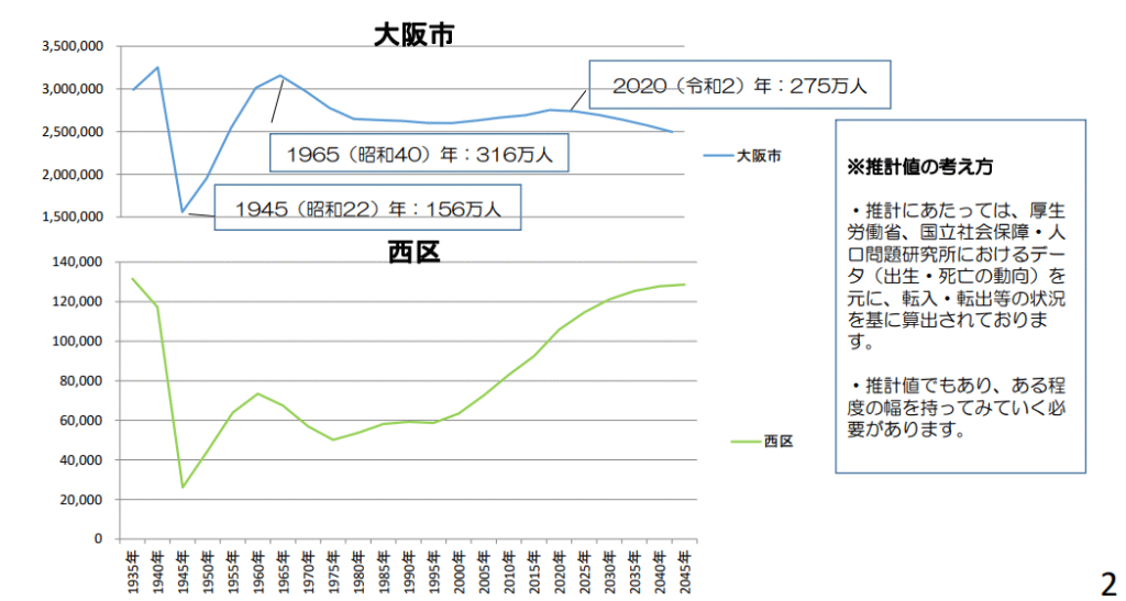 大阪市西区は大阪市の中央部西側に位置し、2020年国勢調査では人口105,862人(24区中14位)、人口密度:20,319人/㎢と市内でトップです。