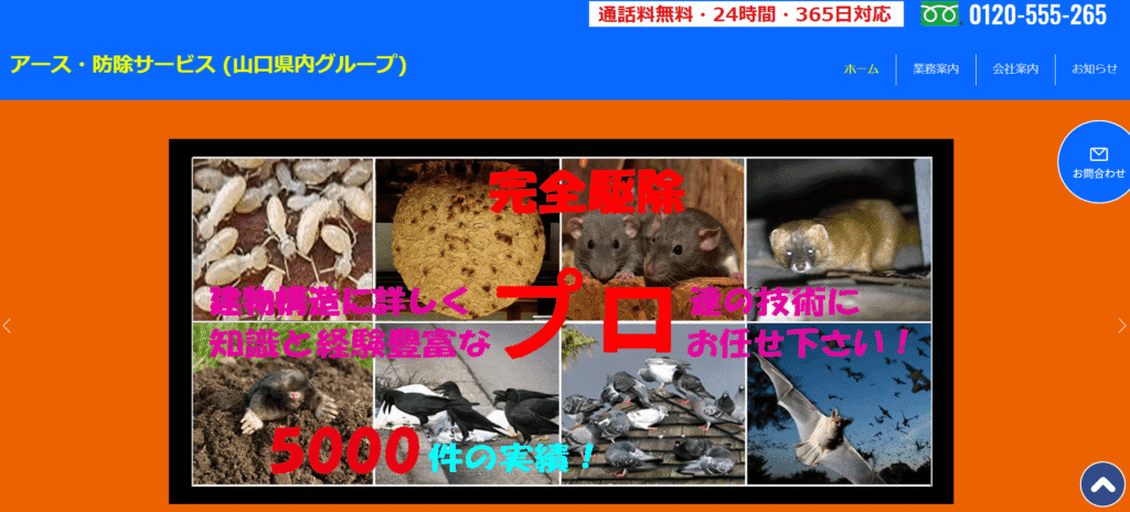 アース・防除サービスは、山口県内全域で害虫・害獣・害鳥の駆除・防除を行う専門業者です。