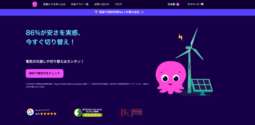 オクトパスエナジーは、環境と家計負担軽減を意識したサービスで、再エネ比率の高い電力を求める方に適しています。