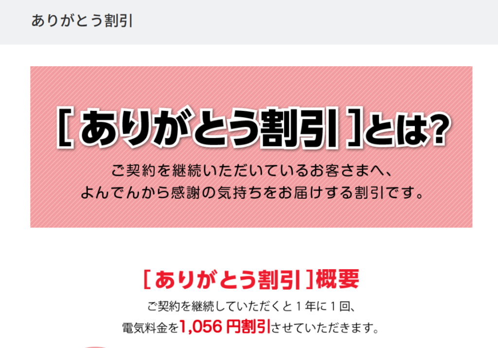 例えば、契約を継続していくことで、1年に1回電気料金を割引する「ありがとう割引」や、同一の振替口座、クレジットカードでお支払いの電気料金を割引するファミリe割引などがあります。