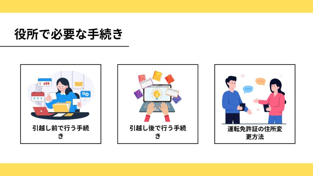 引越し後には、新住所を管轄する役所で以下のような手続きが必要です。