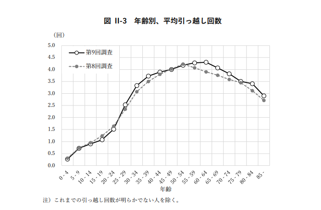 国立社会保障・人口問題研究所「第9回人口移動調査」によると、生まれてから現在までの引っ越し回数の平均は3.24回であり、20代前半から40代前半が引っ越しのピークになります。