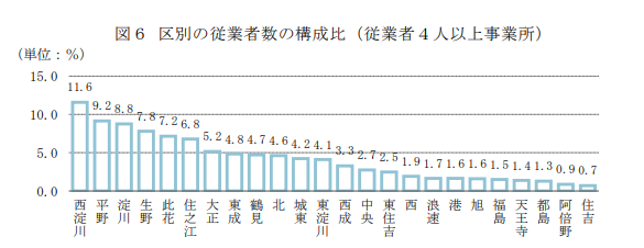 西淀川区は製造業と卸売・小売業が中心で、事業所数・従業者数ともに市内上位に位置します。