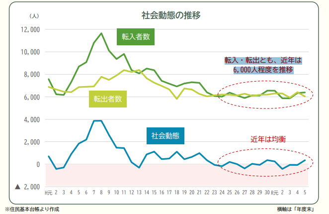 令和5年の転入者数は6,388人、転出者数は6,037人と平成25年から転入・転出とも
