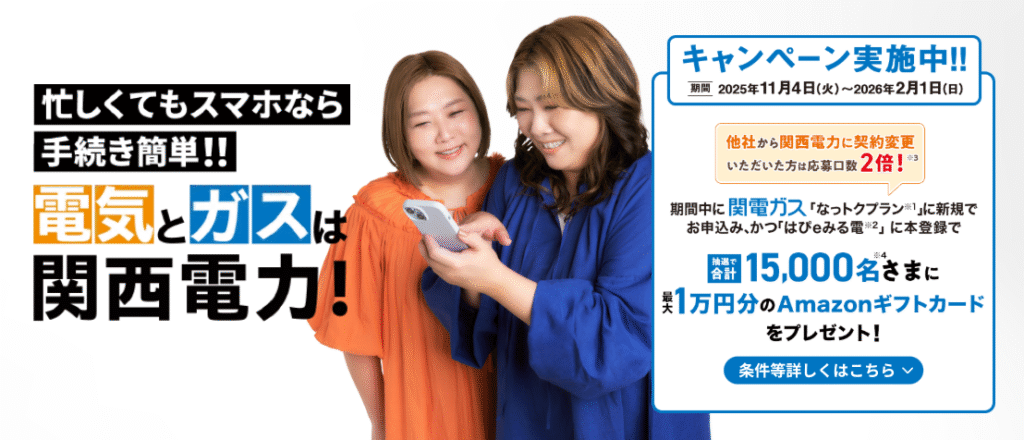 | 対象 | 期間中に、関電ガス「なっトクプラン」に新規で申し込みし、2026年3月31日(火)までに需給開始したうえで、需給開始から1年以上契約を継続している人 |