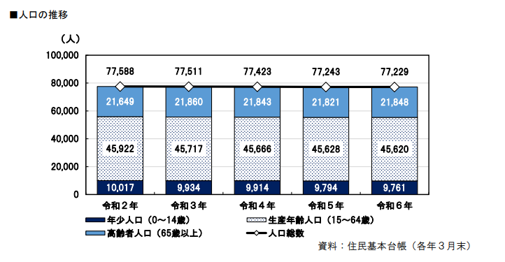 交野市は大阪府北東部に位置しており、令和7年5月時点の人口は77,325人です。