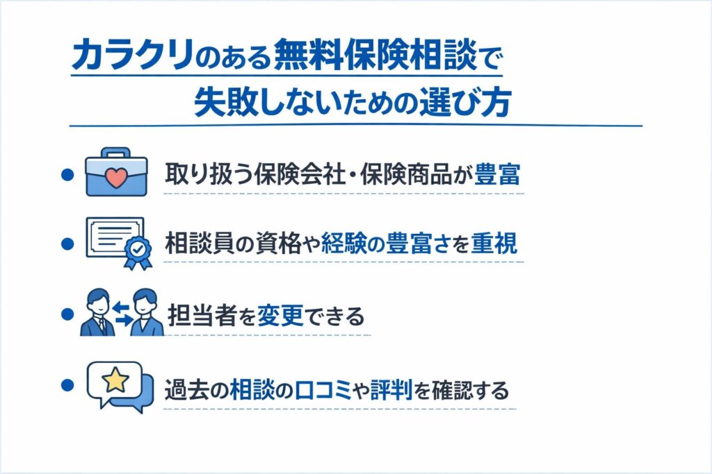 特に、取り扱い保険会社数が多い窓口や、FP資格を持つ相談員が在籍しているサービスを選ぶと、より中立的で幅広い提案を受けられます。