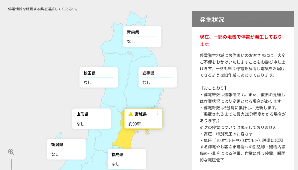 東北電力では、停電情報がサイトから確認できるため、他の住宅にも影響があるのか知りたいときはぜひ活用してください。