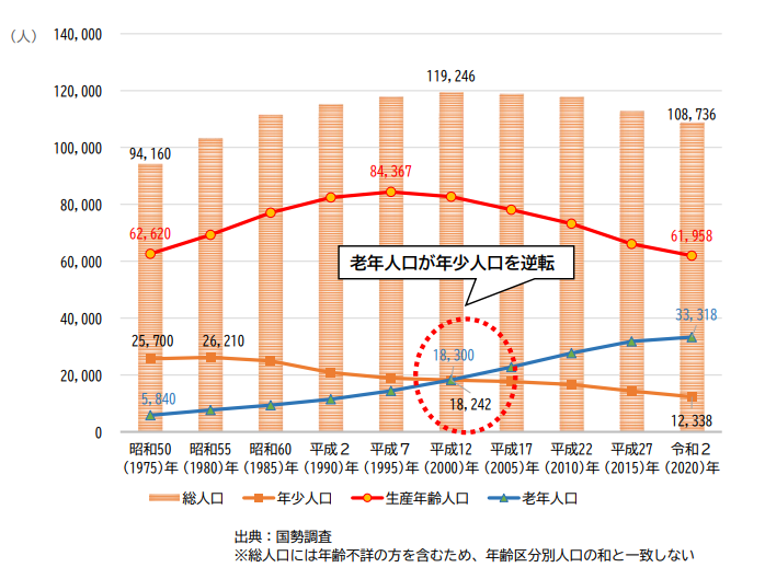 人口は、平成12年の119,246人をピークに減少が続いています。