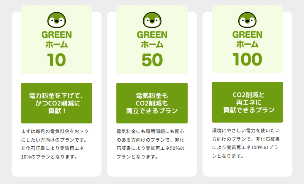 再生可能エネルギーの使用割合が10%、50%、100%の3つから選べるので、環境に配慮した電力を使用したい方にぴったりです。