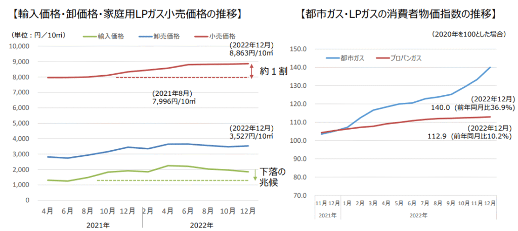 さらに、2022年12月末時点のLPガス小売価格は8,863円とコロナ禍の最低価格7,996円と比較すると約1割上昇しており、家計の電気代を圧迫する要因の一つといえます。