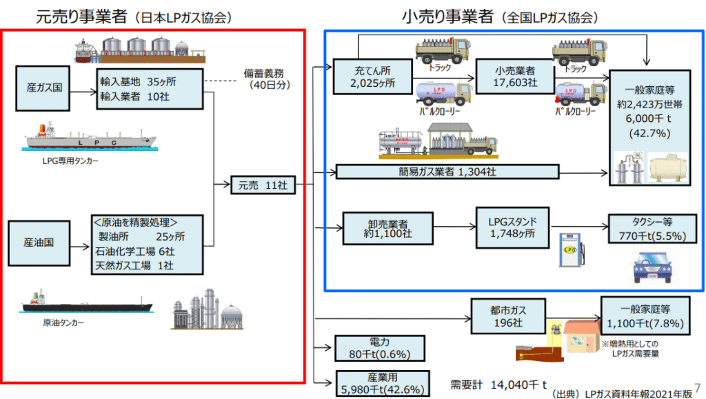 プロパンガスは、高圧ガスの容器配送という特性から、流通経路が多段階で複雑です。